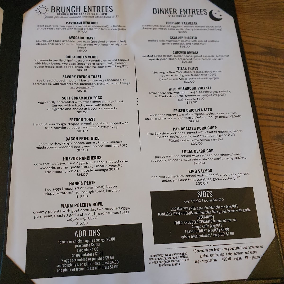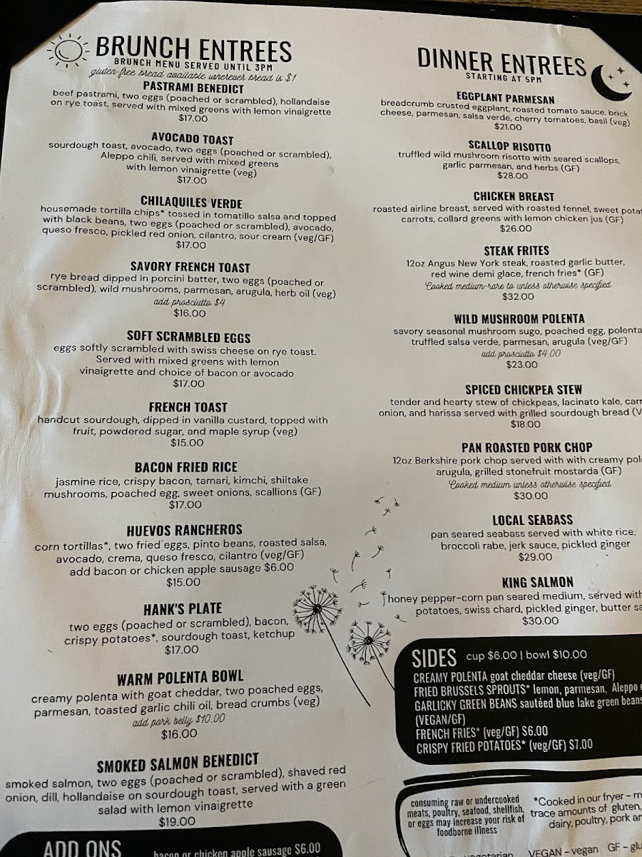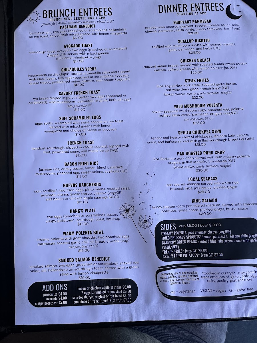 hand-cut sourdough, dipped in vanilla custard, topped with fruit, powder sugar and maple fruit varies upon season